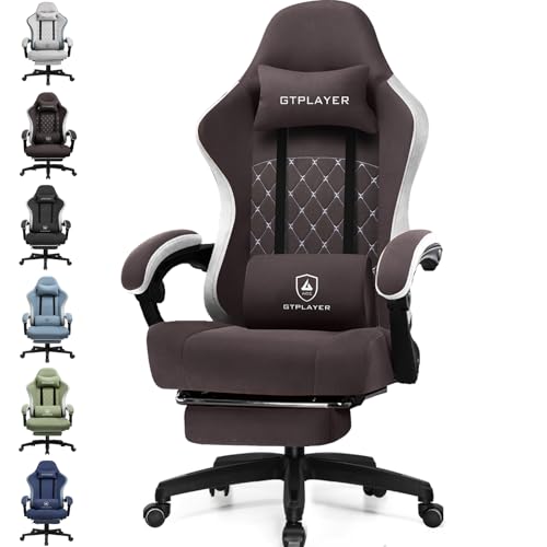 GTPLAYER Gamingstol, ergonomisk gamingfåtölj, skrivbordsstol med tygyta, fjädrad sittdyna samt arm- och fotstöd, brun