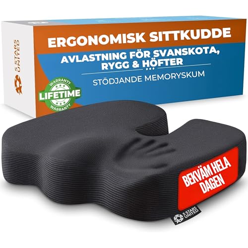 5 STAR UNITED Sittdyna i minnesskum, ergonomisk svanskotedyna för kontorsstol, ischias & ryggsmärta, halkfri, bärbar, tvättbart överdrag - svart