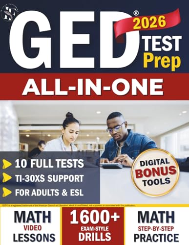 GED Test Prep All-in-One: 10 Full-Length Practice Tests; Step-by-Step Math Explanations; Lessons for Adults & ESL; TI-30XSTM Support for Every Math Skill; Strategies to Lower Test Anxiety.