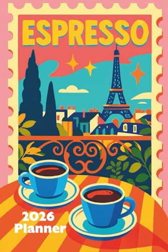 2026 Planner Espresso Paris: Beautiful Postage Stamp Notebook Calendar, Paris Scene Featuring a Balcony with 2 cups of Espresso Overlooking the City and Eiffel Tower