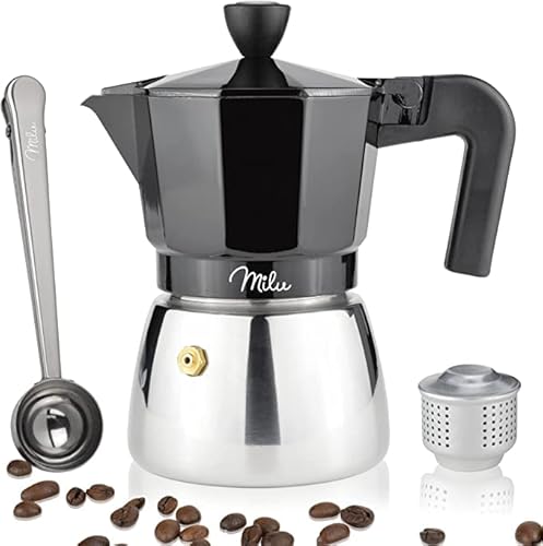 Milu Espressobryggare lämplig för induktion | 3, 6, 9 koppar | aluminium/rostfritt stål mockakanna, espressokanna, espressobryggare inkl. sked, borste (svart, 3 koppar (150 ml)