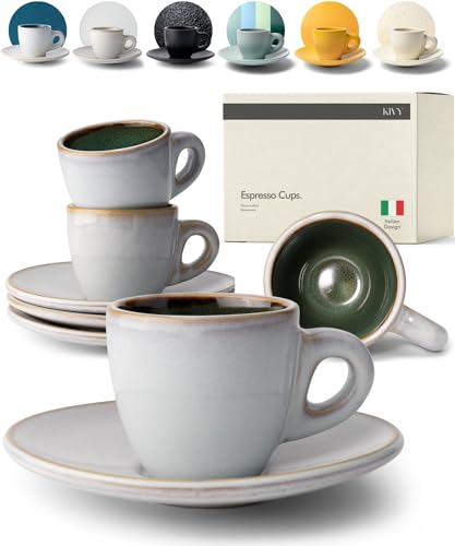 KIVY Espressokoppar i set (4 x 75 ml) – handgjorda, av tjockväggigt stengods – set med koppar med fat – i italiensk stil – stengodskoppar – set med gröna espressomuggar