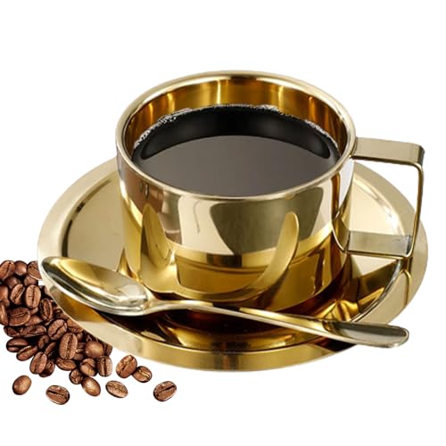 Kaffekoppsset i rostfritt stål, metall kaffemuggar med sked och fat, 200 ml dubbla väggar isolerade tekoppar, europeisk stil kaffemugg, espressomuggar, för kalla drycker eller varm dryck (guld)
