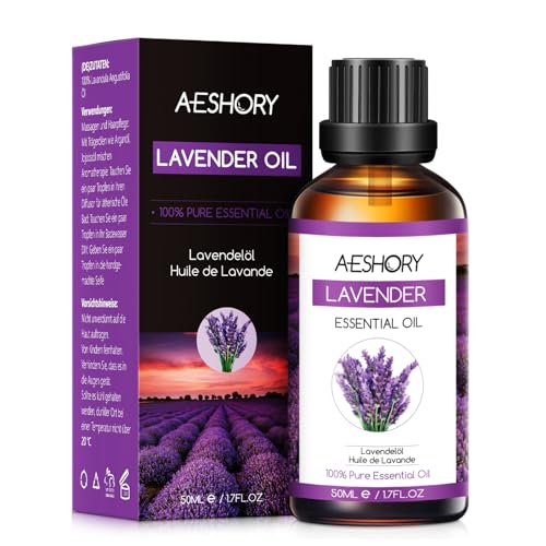 AESHORY Lavendel Eterisk Olja 50ML, Naturliga Lavendelolja Aromaterapioljor, Premium Aroma Diffusorolja Aromaterapi Doftolja för Diffusor, Hudvård, Hårvård, Avslappning, Massage, Bad, Sömnhjälpmedel