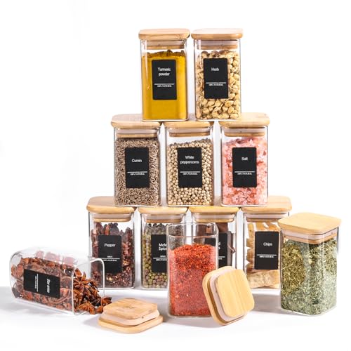 ComSaf fyrkantiga kryddburkar, 12 x 240 ml, förvaringsburkar i glas med bambulock, lufttäta burkar med 54 etiketter, för kryddor, te, torrvaror, skafferi och kök