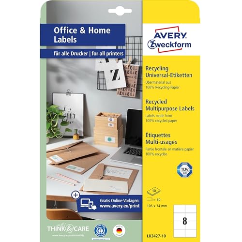 AVERY Zweckform LR3427-10 – Återvinningsbara etiketter (80 adressetiketter, 105 x 74 mm på A4, 100% återvunnet papper, fraktetiketter, självhäftande, 10 ark), vit färg