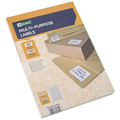 D.RECT självhäftande etiketter universaletiketter (25 x 10 mm på DIN A4) självhäftande 100 ark/förpackning 189 etiketter/blad 18 900 stycken vita