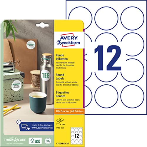 AVERY Zweckform L7104REV-25 runda etiketter (för tryck, självhäftande, Ø 60 mm, A4, 300 klistermärken på 25 ark, självhäftande prickar för märkning av dokument, produkter) vit