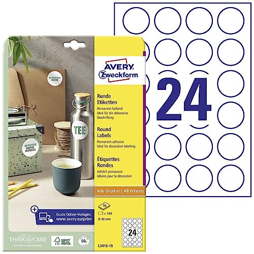 AVERY Zweckform Runda etiketter L3415-10 (240 klistermärken på 10 ark, för tryck, självhäftande, Ø 40 mm, A4, självhäftande prickar för märkning av dokument, produkter) vit