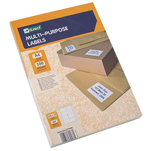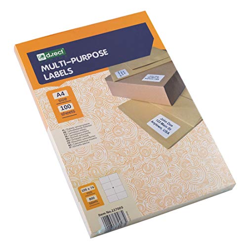 D.RECT självhäftande etiketter universaletiketter (105 x 74 mm på DIN A4) självhäftande 100 ark/förpackning 8 etiketter/blad 800 stycken vita