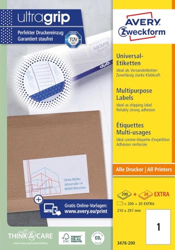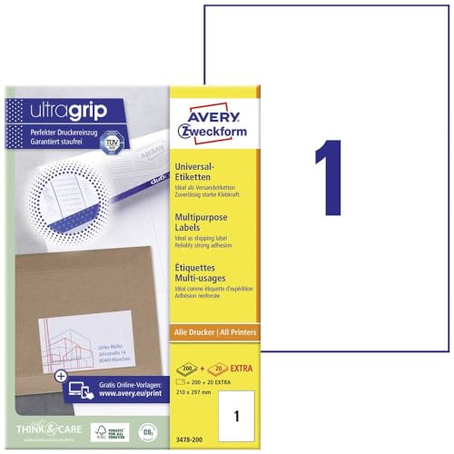 AVERY Zweckform 3478–200 universella etiketter (200 plus 20 självhäftande etiketter extra, 210 x 297 mm på A4, tryckbara fraktetiketter, självhäftande fraktklistermärken med ultragrip) 220 ark, vit