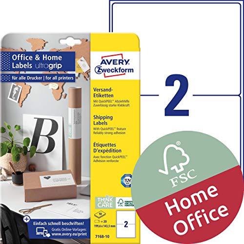 Avery Zweckform L7168-10 raderetiketter (20 etiketter, 199,6 x 143,5 mm på DIN A4, självhäftande fraktdekal med ultragrip, för paket, tryckt med laserskrivare) 10 ark, vit