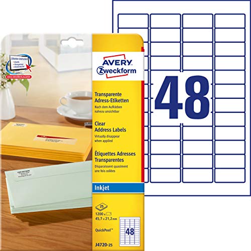 AVERY Zweckform J4720-25 adressetiketter/adressdekal (1 200 etiketter, 45,7 x 21,2 mm på A4, tryckbar, självhäftande, för avsändningsetiketter, polyesterfolie, bläckstråleskrivare) 25 ark, transparent