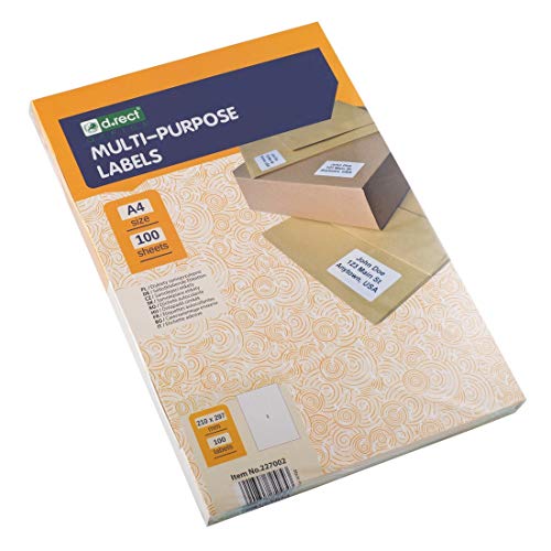 D.RECT Universella etiketter (210 x 297 mm på DIN A4) utskrivbara självhäftande 100 ark per förpackning 1 etikett/ark 100 stycken vit