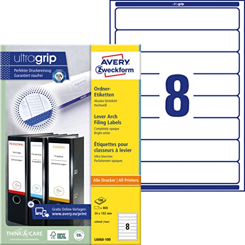 AVERY Zweckform L6060-100 Etiketter på mapp (med ultragrepp, 34 x 192 mm på A4, smal/kort, självhäftande, ogenomskinliga, tryckta mappetiketter, 800 ryggetiketter på 100 ark) vit
