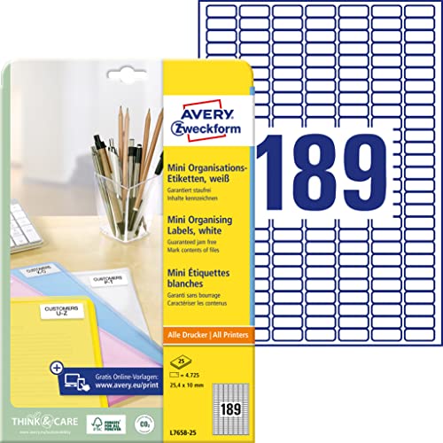 AVERY Zweckform L7658-25 miniorganisationsetiketter (25,4 x 10 mm på DIN A4, självhäftande etiketter för flera ändamål, utskrivbara, för organisering och märkning) 4,750 klistermärken på 25 ark, vit