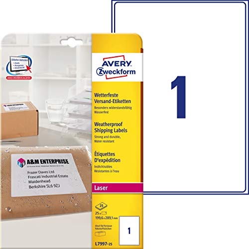 AVERY Zweckform L7997-25 väderbeständiga fraktetiketter/fraktklistermärken (25 etiketter, 199,6 x 289,1 mm på DIN A4, tryckbar, självhäftande, för paket, paket och fraktrullar) 25 ark, vit