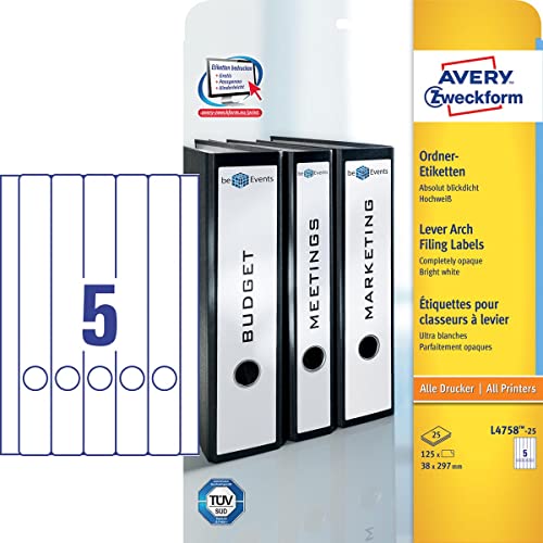 AVERY Specialform L4758-25 mapperlappar etiketter (med ultragrip, 38 x 297 mm på DIN A4, smal/lång, självhäftande, iögonfallande, tryckta mappetiketter, 150 bakskyltar på 30 ark) vit
