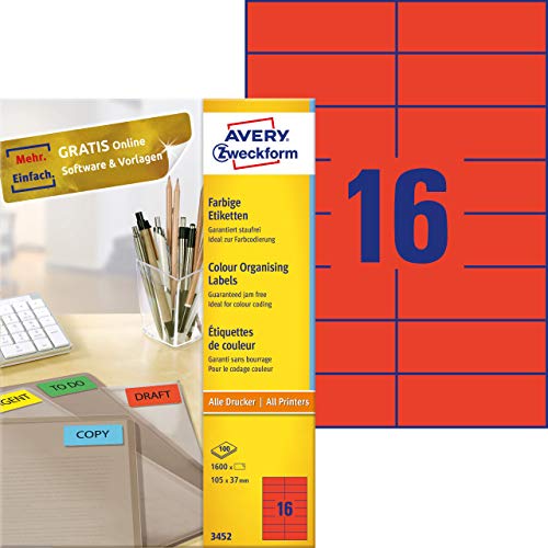 AVERY Zweckform 3452 röda etiketter (1 600 klistermärken, 105 x 37 mm på A4, permanent vidhäftning, självhäftande färgetiketter, matt papper, tryckbara, färgade självhäftande etiketter) 100 ark