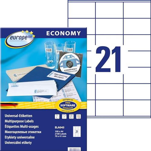 europe100 ELA045 universaletiketter A4 (70 x 41 mm, 2 100 etiketter på 100 ark, självhäftande, 3481) vit