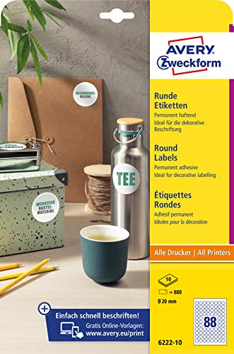 AVERY Zweckform 6222–10 runda etiketter (880 självhäftande prickar, Ø 20 mm på A4, runda klistermärken för tryck, självhäftande produktetiketter, permanent självhäftande syltetiketter) 10 ark, vit