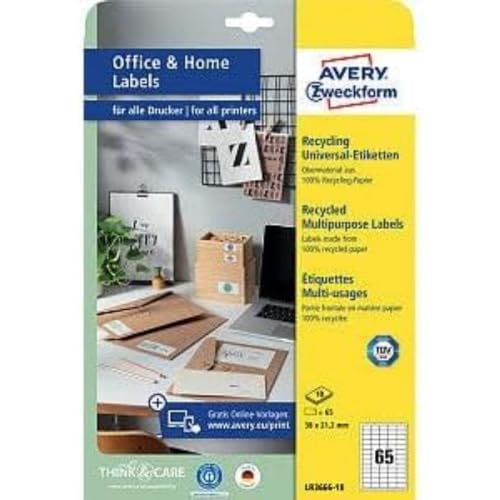 AVERY Zweckform LR3666-10 återvinningsetiketter (650 adressklistermärken, 38 x 21,2 mm på A4, 100% återvunnet avfall papper, utskrivbara universella etiketter, självhäftande etiketter) 10 ark,