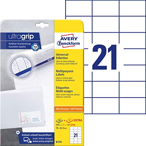 AVERY Zweckform 6174 adressdekal (525 plus 105 självhäftande etiketter extra, 70 x 42,3 mm på A4, matt papper med tryckbara avsändaretiketter, självhäftande adressetiketter med ultragrepp) 30 ark, vit