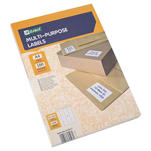 D.RECT självhäftande etiketter universaletiketter (70 x 25,4 mm på DIN A4) självhäftande 100 ark/förpackning 27 etiketter/blad 2 700 stycken vita