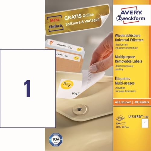 AVERY Zweckform L4735REV-25 universella etiketter (25 plus 5 självhäftande etiketter extra, 210 x 297 mm på A4, avtagbar utan att lämna några rester, tryckbara, självhäftande klistermärken) 30 ark,