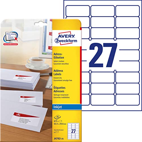 AVERY Specialform J4792-25 adressetiketter/adressetiketter (63,5 x 29,6 mm på DIN A4, tryckt, självhäftande, idealisk för C6-kuvert, pappersmatta, för bläckstråleskrivare, 675 etiketter, 25 ark) vit
