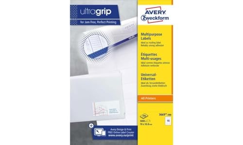 AVERY Zweckform 3669-200 adressklistermärken (3 000 plus 300 självhäftande etiketter extra, 70 x 50,8 mm på A4, utskrivbara avsändaretiketter, självhäftande adressetiketter med ultragrip) 220 ark, vit