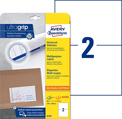 AVERY Specialform 6176 universaletiketter (med ultraljud, 210 x 148 mm på DIN A4, papper matt, tryckbar, självhäftande, 60 självhäftande etiketter för DHL och Hermes på 30 ark) vit