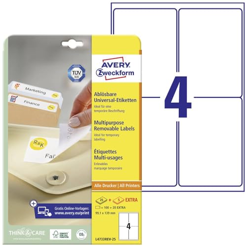 AVERY Zweckform L4733REV-25 universella etiketter (100 plus 20 självhäftande etiketter extra, 99,1 x 139 mm på A4, avtagbar utan att lämna några rester, tryckbara, självhäftande klistermärken) 30 ark,