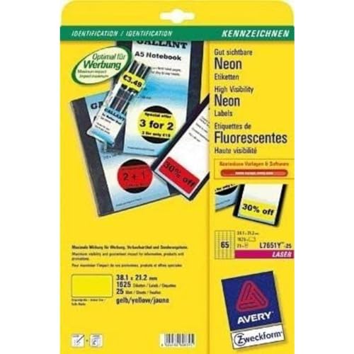AVERY Zweckform L7651Y-25 självhäftande etiketter neongul (A4, avtagbar, 38,1 x 21,2 mm, för tryck, 1 650 klistermärken på 25 ark, färgade självhäftande etiketter för tydlig märkning)