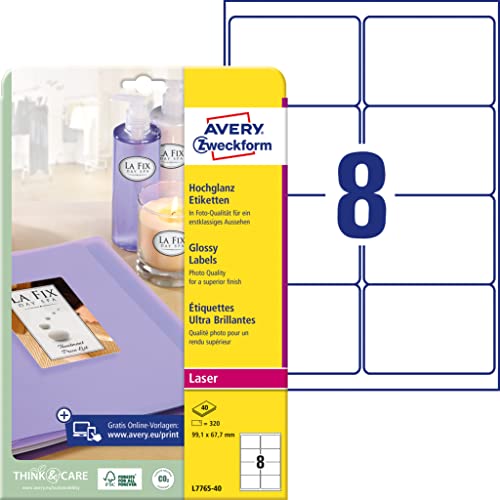 AVERY Zweckform L7765-40 högglansiga etiketter (320 glansiga klistermärken, 99,1 x 67,7 mm på A4, självhäftande, utskrivbart, högglansigt papper för produktmärkning, för laserskrivare) 40 ark, vit