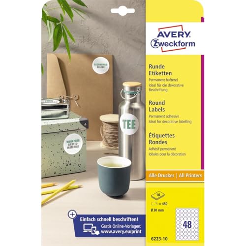 AVERY Zweckform 6223–10 runda etiketter (480 självhäftande prickar, Ø 30 mm på A4, runda klistermärken för tryck, självhäftande produktetiketter, permanent självhäftande syltetiketter) 10 ark, vit