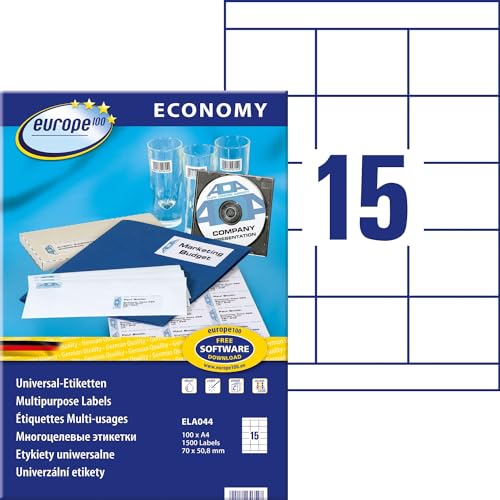 Europe100 Art. ELA044 adressdekal (1 500 självhäftande etiketter, 70 x 50,8 mm på A4, matt papper, individuellt tryckbart, självhäftande adressetiketter, kompatibel med AVERY 3669) 100 ark, vit