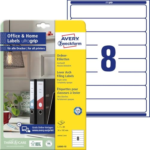 AVERY Zweckform L6060-10 etiketter för mappar (80 ryggskyltar med ultragrepp, 34 x 192 mm på A4, smal/kort, självhäftande, helt ogenomskinliga, skrivbara mappetiketter) 10 ark, vit