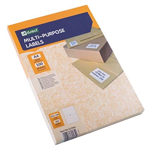 D.RECT självhäftande etiketter universaletiketter (210 x 148 mm på DIN A4) självhäftande 100 ark/förpackning 2 etiketter/blad 200 stycken vita