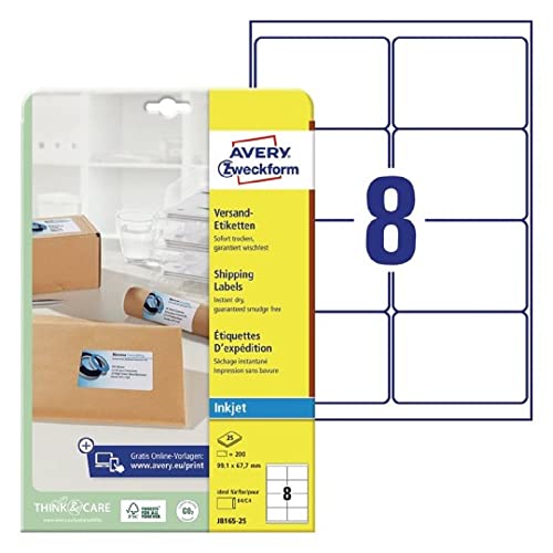 AVERY Zweckform J8165-25 fraktetiketter/fraktklistermärken (200 etiketter, 99,1 x 67,7 mm på A4, tryckbar, självhäftande, för bläckstråleskrivare, för DIN B4/C4-kuvert) 25 ark, vit