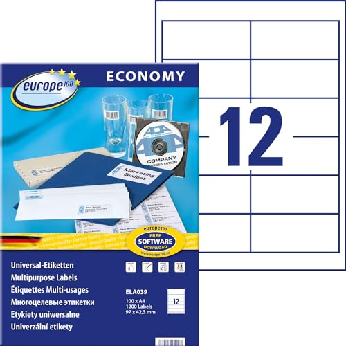 Europe100 Art. ELA039 adressdekal (1 200 självhäftande etiketter, 97 x 42,3 mm på A4, matt papper, individuellt tryckbart, självhäftande adressetiketter, kompatibel med AVERY 3659) 100 ark, vit