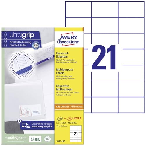 AVERY Zweckform 3652-200 adressklistermärken (4 200 plus 420 självhäftande etiketter extra, 70 x 42,3 mm på A4, tryckbara avsändaretiketter, självhäftande adressetiketter med ultragrepp) 220 ark, vit