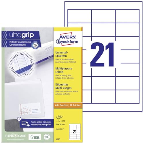 AVERY Specialform 3670 adressetikett (med ultraljud, 64 x 36 mm på DIN A4, pappersmatta, tryckbara, självhäftande adresseetiketter, 2 100 självhäftande etiketter på 100 ark) vit