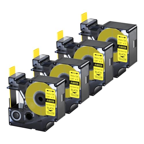 4-pack industriella värmekrymprör för DYMO 18058 etikettband för trådkablar 3/4 tum x 5 fot 19 mm x 1,5 m, med DYMO Rhino Pro 4200 5200 500 6000 industriell RhinoPro etikettmaskin, svart på gul