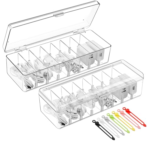 WuGU 2 stycken kabelförvaringslåda, transparent kabelorganiseringslåda med 8 avtagbara fack och 17 buntband, kabelhanteringsbox för skrivbordsförvaring, kontor med etikettpapper