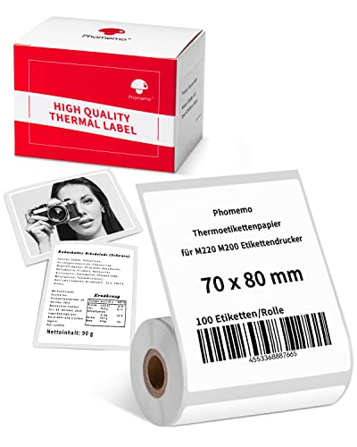 Phomemo termiskt etikettpapper för etikettskrivare M220 M250 M221, multifunktionell självhäftande etikett, för kontor, lager, adressetikett, 70 x 80 mm (2,75 x 3,14 tum), 100 etiketter/rulle