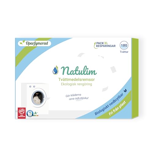 Natulim - Tvättmedelsremsor (180 tvättar) - Inklusive mjukmedel, ekologiskt, allergivänligt, tillverkat i EU - Kläderna blir rena och mjuka utan att smutsa ner planeten (Doftfri)