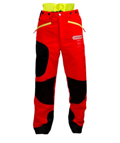 Oregon Waipoua motorsåg skyddsbyxor, typ A klass 1 motorsågskydd, justerbar lätt andningsbar förstärkt kläder, storlek S/EU 42-44 – Hi Vis röd/gul/svart (295469/S)