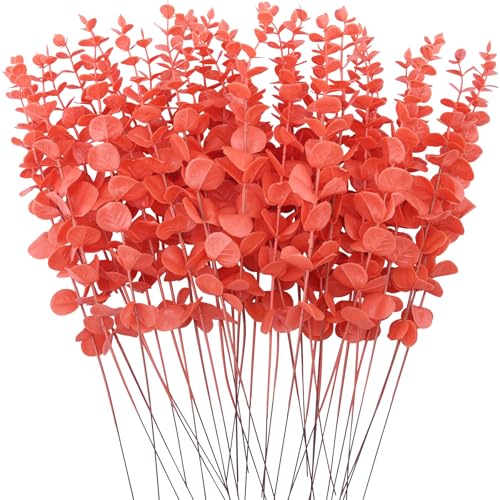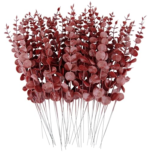 FEQO 36 st röda eukalyptusstjälkar konstgjorda eukalyptusblad dekor eukalyptusgrenar falska eukalyptus med falska löv 38 cm falsk eukalyptusstam för vas bröllopsbukett hem