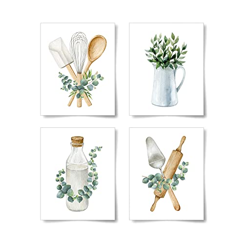 La Naranja Boho kök väggdekor salviagröna växter botaniska tryck eukalyptusblad väggkonst minimalistisk matsal konstverk, set med 4 bilder, 20 x 25 cm, oinramad